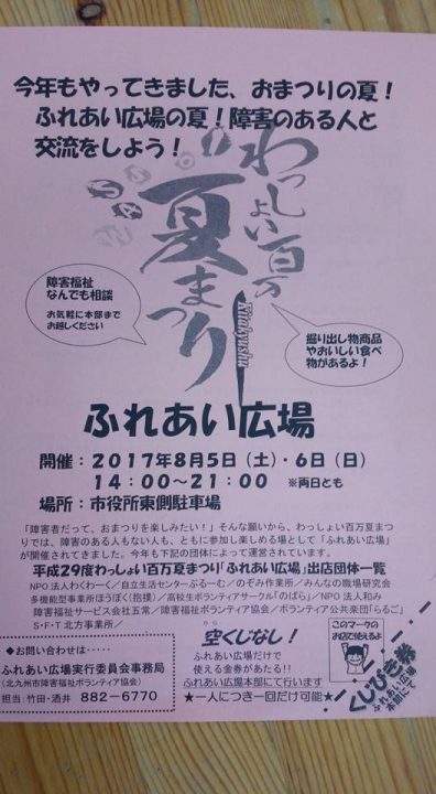 8月5,6日はわっしょい百万夏まつり!! 今年も市庁舎横公用車駐車場の場所、ふれあい広場に参加します(^_^)/ 14のブースで市内の福祉事業所やボランティアグループがみなさまとの交流を楽しみにしています☆