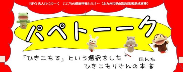 わくわーく 平成29年度こころの健康啓発セミナー第2弾!! 九州ユースワークカレッジさんのご協力を得て、「ひきこもる」を選択したひきこもりさんの本音を語っていただきます。 パペットになったひきこもりさん。カレッジの校長先生からのお題に答えていき... -