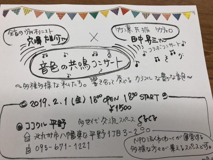 2月1日(金)18:30開演(18:00会場) ココクル平野・くるくるスペースにて全盲のヴァイオリニスト 穴澤雄介さんと 竹凛共振 チェロ奏者田中昇三さんの 初共演ライブです。 6月のライブから半年ぶり(*^-^*)くださいます! 再び素敵な音を聞かせてくださ...