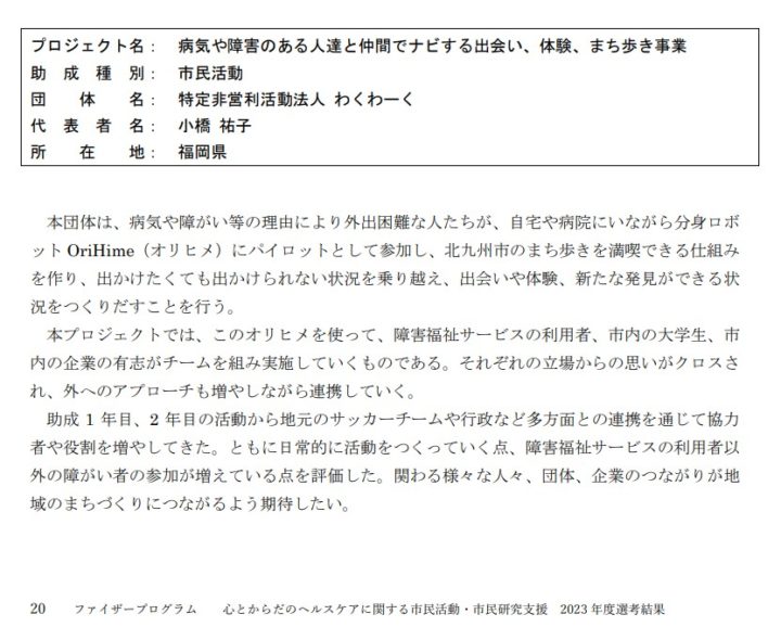 助成いただいているのは、ファイザー株式会社様の「ファイザープログラム―心とからだのヘルスケアに関する市民活動・市民研究支援」で、2023年12月初旬に東京のファイザー本社で行われた贈呈式に招待していただきました。
