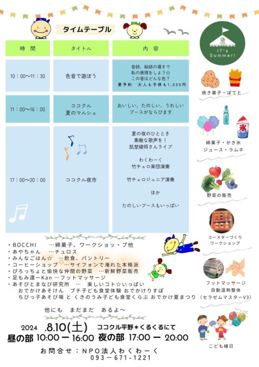 ・新鮮野菜 ・おいしいお菓子 ・チュロス ・綿菓子 ・かき氷