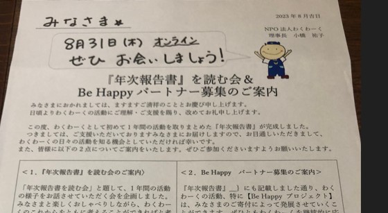 みなさま! いつもわくわーくにご支援、ご協力をいただきありがとうございます。わくわーくでは、1年間の活動をまとめた年次報告書を昨年より発行しています。この度、昨年度1年間の活動を取りまとめた『年次報告書2023』が完成しました。今回の報告書も... -